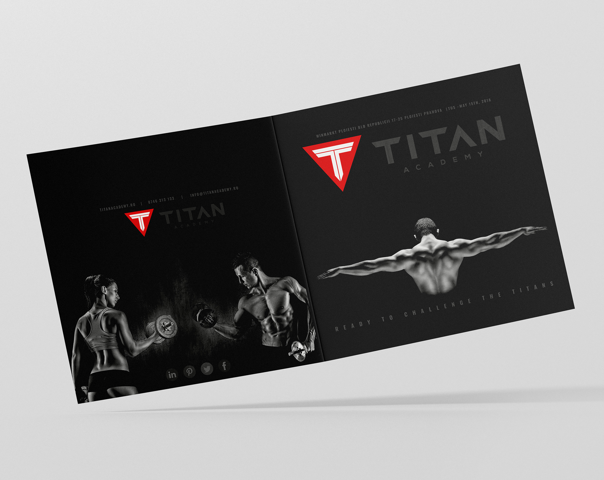 The brochure was created to advertise the opening of an exclusie gym TITAN ACADEMY. The graphics promote the core values of the gym such as developing an unbeatable spirit, building real relationships, doing what others won't and growing through constant learning.